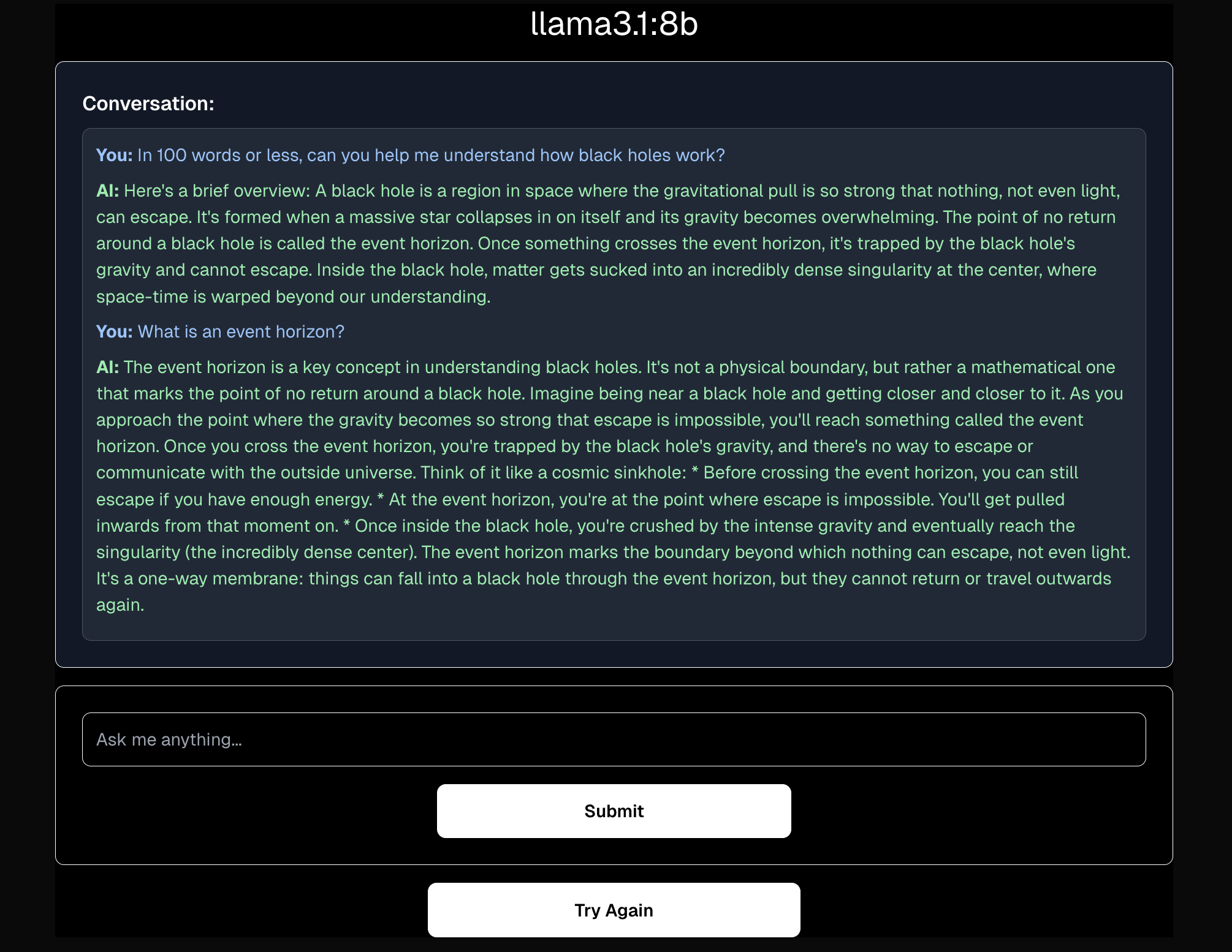 Access the chatbot at: http://localhost:3000 and enter prompt to start a conversation.